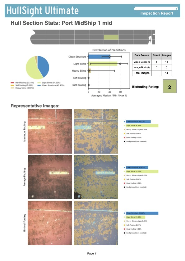 Each inspected hull section received comprehensive documentation with detailed statistical analysis—including fouling percentages, median values, minimum/maximum ranges, total analyzed images, and overall biofouling ratings—paired with carefully selected sample images that provide vessel operators with a clear, verifiable picture of the hull’s condition.