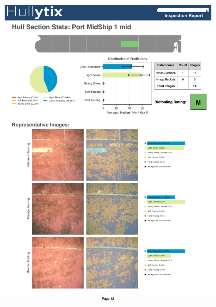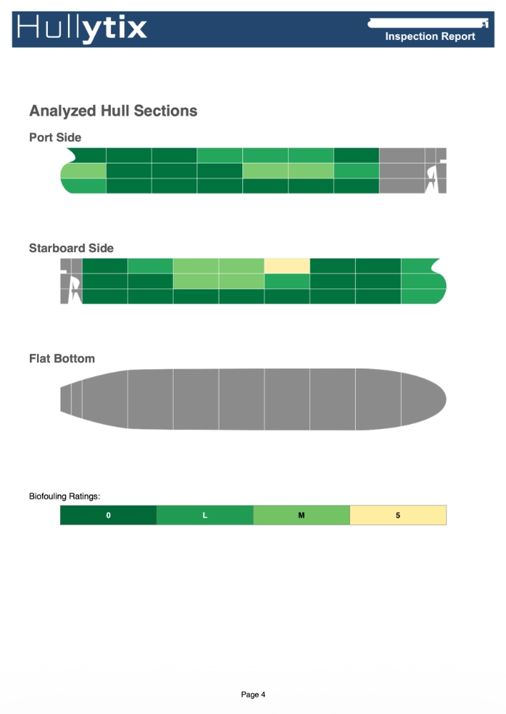 The generated report delivered immediate, actionable insights into the vessel’s condition through a comprehensive overview of all inspected hull sections with their corresponding biofouling ratings. Hullytix’s flexible biofouling scales can be fully customized by customers to align with specific reporting requirements and industry standards, ensuring the analysis meets both internal quality protocols and external regulatory expectations.