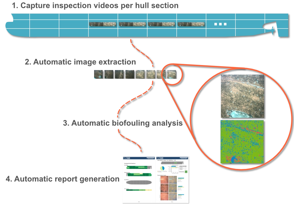 HullVAR is a cloud-based solution for automated processing of underwater hull inspection videos. During inspections, videos are captured from different sections of the ship hull. The data is then uploaded to the system, where images are automatically extracted from the videos to ensure the inspected area is covered completely. The advanced computer vision engine analyzes the amount and type of biofouling attached to the surface. With a single click, you can generate a standardized biofouling report or export data in structured formats for integration with existing maintenance management systems.
